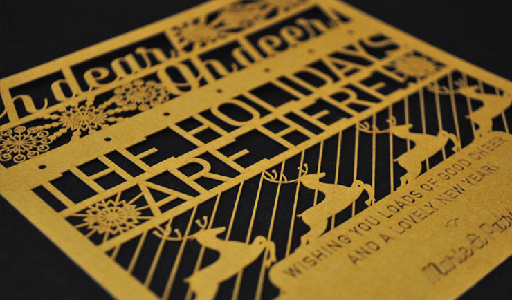 Vector drawn and laser-cut Christmas card on metallic gold paper