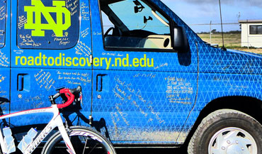 Jersey and van wrap designs for the yearly, cross-country bike trip taken by Notre Dame's Dean of the College of Science, Gregory Crawford, to raise awareness for Niemann-Pick Type C disease, photos by Peter Doran